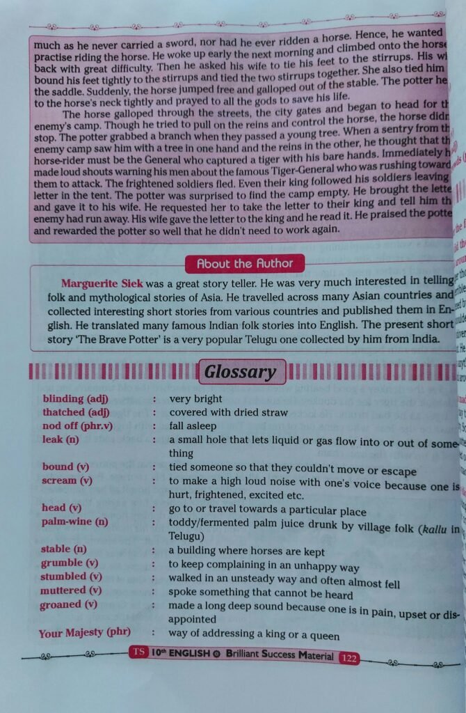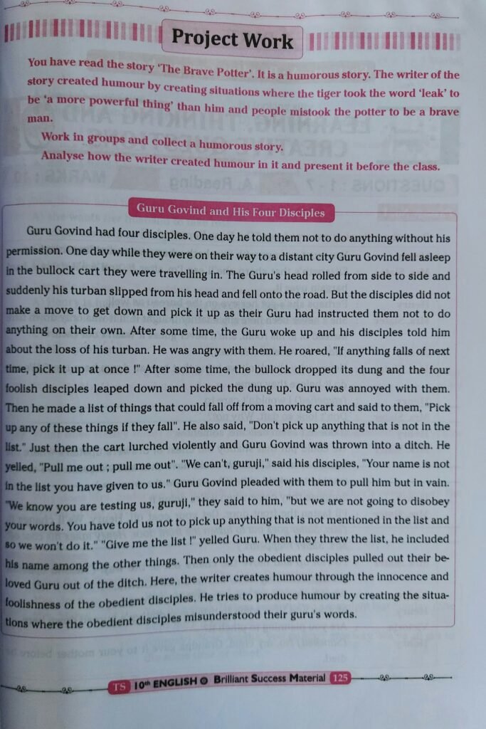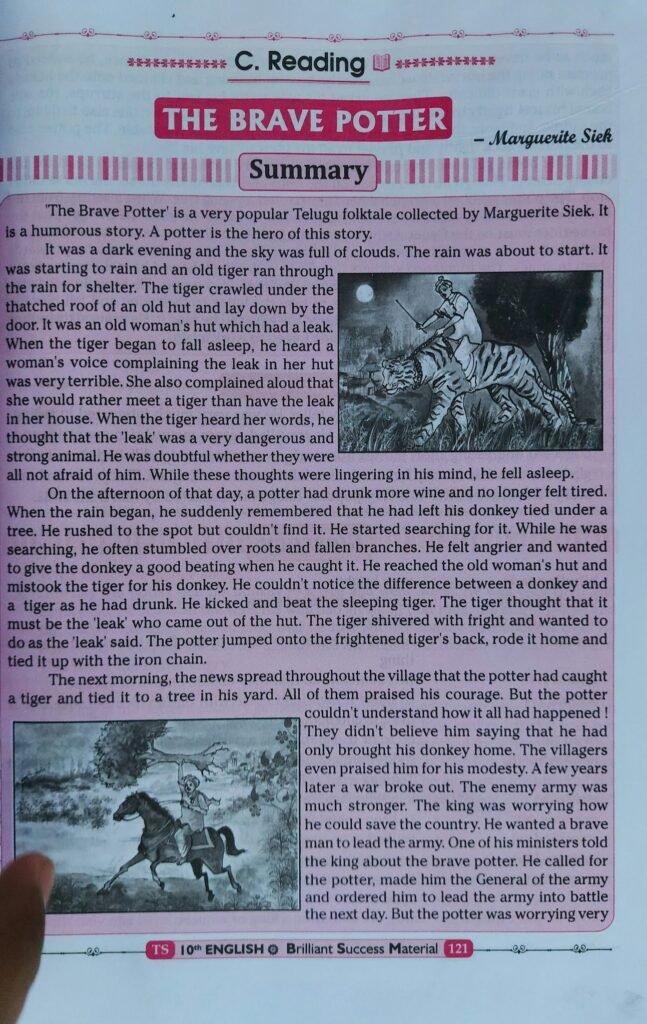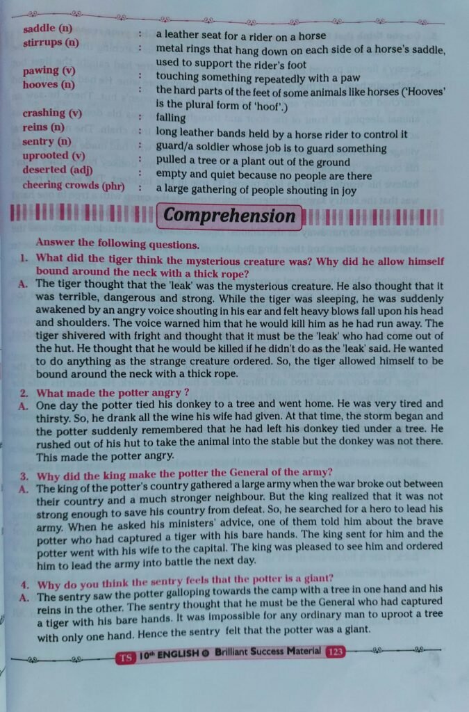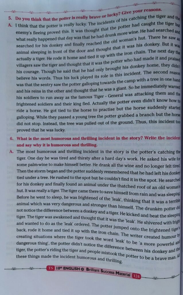 Ans.The most humorous and thrilling incident in the story is the potter’s catching the tiger. One day he was tired and thirsty after a hard day’s work. He asked his wife for some palm-wine to make himself better. He drank all the wine and no longer felt tired. Then the storm began and the potter suddenly remembered that he had left his donkey tied under a tree. He rushed to the spot but he couldn’t find it in the spot. He searched for his donkey and finally found an animal under the thatched roof of an old woman’s hut. It was really a tiger. The tiger came there to save himself from rain and was sleeping Before he went to sleep, he was frightened of the ‘leak’, thinking that it was a terrible animal which was very dangerous and stronger than himself. The drunken potter did not notice the difference between a donkey and a tiger. He kicked and beat the sleeping tiger. The tiger was awakened and thought that it was the ‘leak’. He shivered with frigh and wanted to do as the ‘leak’ ordered. The potter jumped onto the frightened tiger: back, rode it home and tied it up with the iron chain. The writer created humour b creating situations where the tiger took the word ‘leak’ to be ‘a more powerfu dangerous thing’, the potter didn’t notice the difference between his dor rful and tiger, the potter’s riding the tiger and people mistook the potter to be these things made the incident humorous and thrilling.